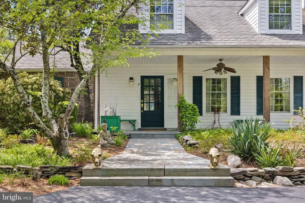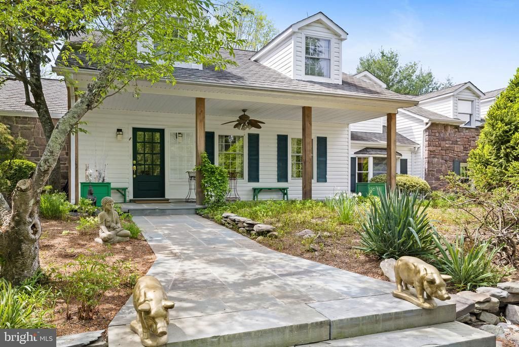Located on one of the most picturesque, coveted roads in Solebury Township, that features a historic covered bridge, is an expanded Cape Cod residence. The home, which sits on 3 bucolic acres, is surrounded by lush mature landscaping, walking trails, and stone terraces. And don’t forget the pool and koi-filled pond! Elegantly refreshed and thoughtfully designed, the residence boasts architectural details and generous living spaces just minutes from downtown New Hope. From the moment you arrive, the expansive covered front porch sets the tone with its charming flagstone flooring that evokes the timeless beauty of a Southern veranda. Step inside to discover wood flooring, mostly throughout, custom wainscoting, four fireplaces and a breakfast room that is continually bathed in natural light. Most coveted is a first floor primary bedroom with a sumptuous en-suite bath that features a soaking tub and walk-in shower. The first floor plan continues with a formal dining room and living room that flank the entryway. Facing the spectacular lawn and gardens is a cozy sitting room which is adjacent to the breakfast room and gourmet kitchen, outfitted with top-tier Viking and Subzero appliances, a cooking island, wet bar with a copper sink and custom cabinetry. The eat-in breakfast room flows seamlessly into the adjoining spacious and airy sitting room . Also on the first floor is a "Ralph Lauren" library with fireplace, an over-sized half bath and a laundry room. A newer and separate wing offers a grand library, with custom built-in bookcases and a wood-burning fireplace. This wing has a separate staircase to a large Guest Suite with spacious bath. The main upper level offers 2 large bedrooms, and a hall bath. Also included is a two-car side entry attached garage.. This property offers both privacy and tranquility, all within the award winning New Hope-Solebury school district. An extraordinary opportunity to own a residence on one of the idyllic country roads in Solebury!